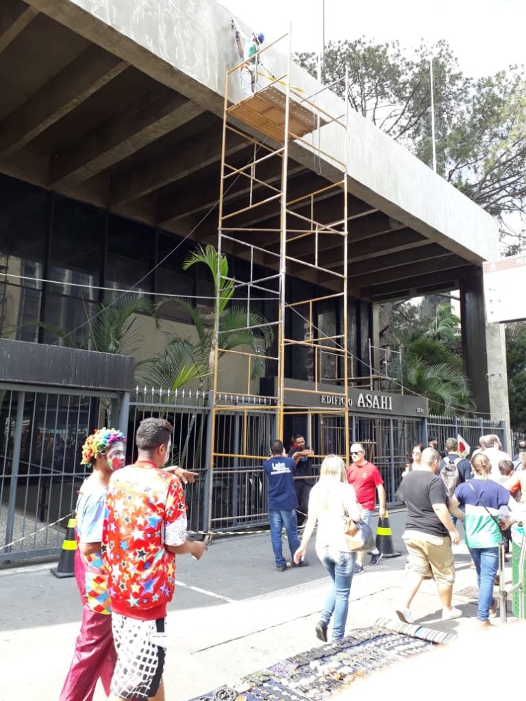 Andaime tubolar sendo utilizado na avenida paulista com toda segurança: Operador com epi’s completo; Isolamento com cones e fita zebrada; rodízios travados; diagonais compatível!